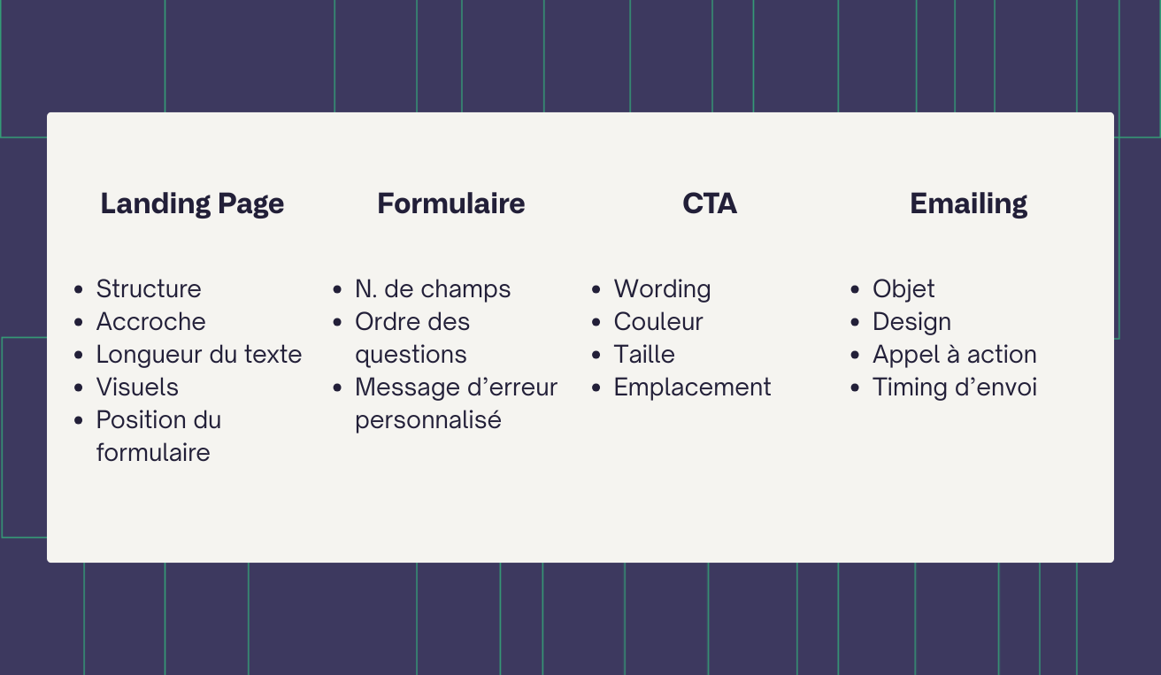 - sur une landing page : la structure globale, l’accroche principale, la longueur du texte, les visuels, ou encore la position du formulaire ;