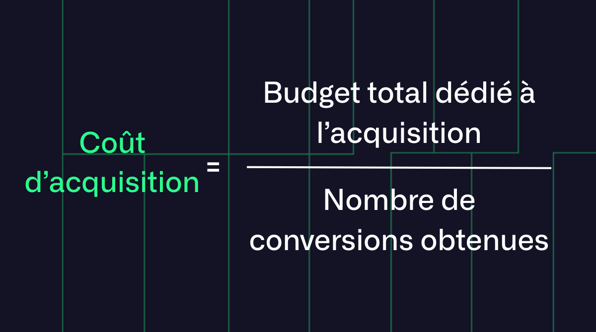 Le coût d'acquisition (ou Customer Acquisition Cost, CAC) est un indicateur clé qui mesure le coût moyen pour obtenir un nouveau client ou générer une conversion (vente, inscription, téléchargement). Il se calcule simplement :