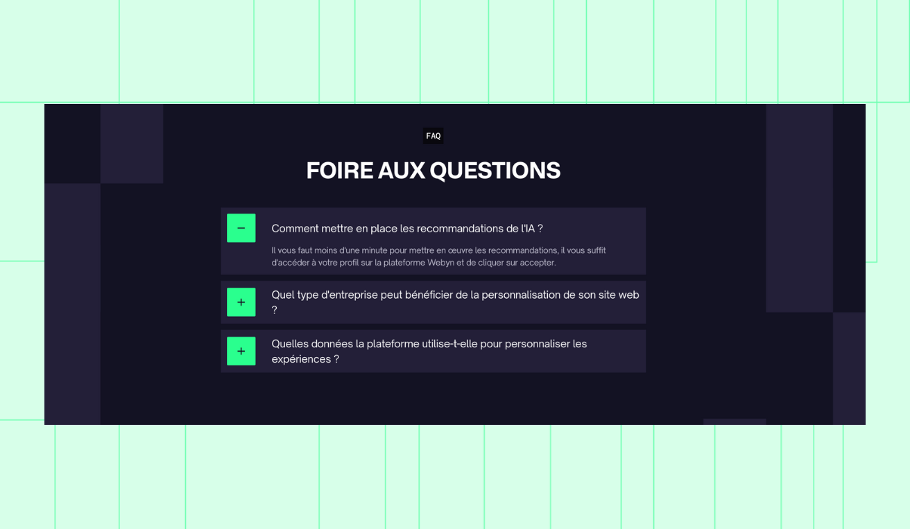 {{cta:L’astuce Webyn|Pour que la FAQ devienne un vrai levier de conversion, partez de données concrètes. Identifiez les moments précis où les visiteurs hésitent (clics interrompus, pauses avant le formulaire, scrolls répétés) autant de signaux qui révèlent les objections implicites à lever avant l’action.}}